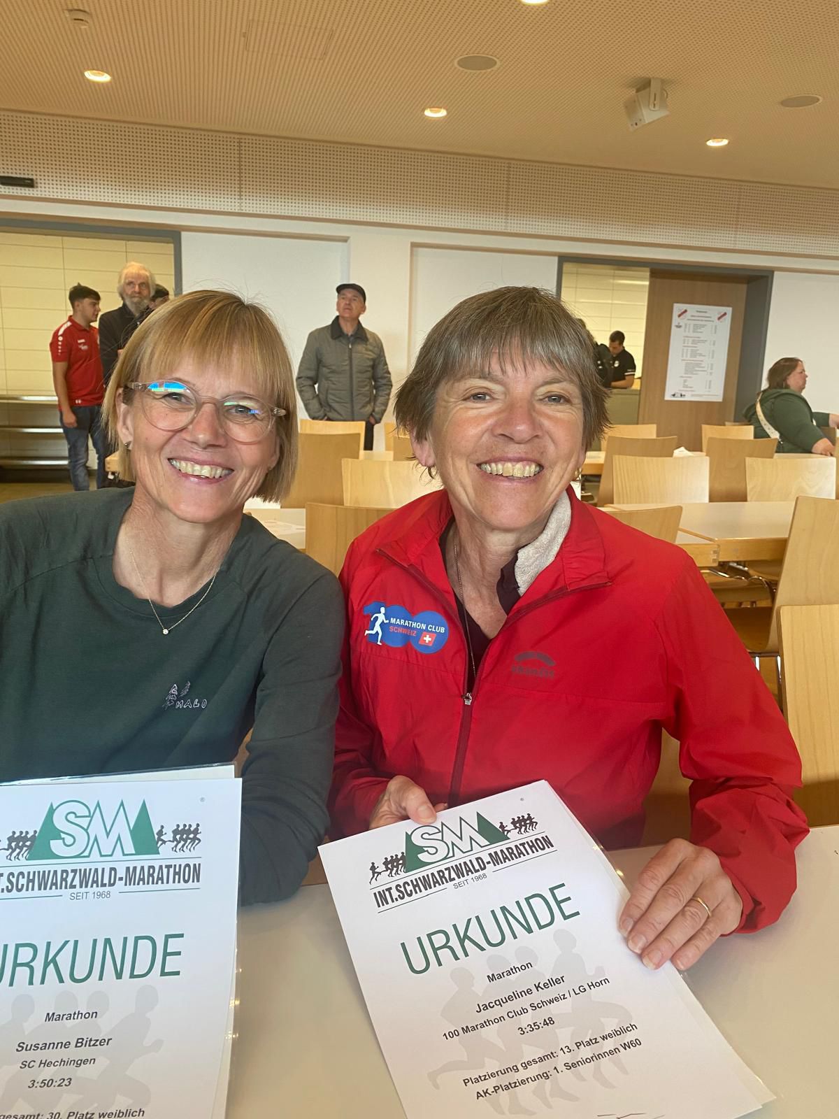 Mit 3h35 war ich dann doch zufrieden. Erst als ich die Uhr auslas, wurden mir die vielen Komplimente bewusst. Der Schwarzwald-Marathon ist mit 483 Metern Höhendifferenz (auch runter) gespickt. Bewusst wurde mir aber vor allem welche Superzeiten uns „früher“ gelangen! Der Vater der Gesamtsiegerin Stefanie Doll, Charly Doll, hat mir bei Kaffee und Kuchen dann erzählt, dass er in 2h26 mal als Zweiter einlief – einer war mit einer Superzeit noch schneller! Im 2025 reichten 2h36 zum Sieg (Lennart Nies). Stefanie Doll von der Super-Sportfamilie (ihr Bruder ist der Biathlet Benedikt Doll) siegte übrigens in 2h53. Bald kam auch Susanne Bitzer an. Sie war mit ihren 3h51 ebenfalls zufrieden. Sie ist übrigens 4 Jahre jünger als ich und erreichte bei den W55 den 3. Rang. Gewonnen wurden die W55 von Tanja Volm, Mitglied „unseres“ 100 Marathon Club Schweiz in 3h41. Die älteren Damen zeigten also, was in ihnen steckt.