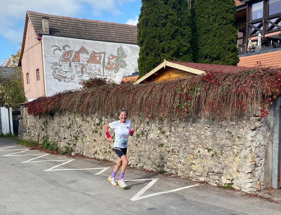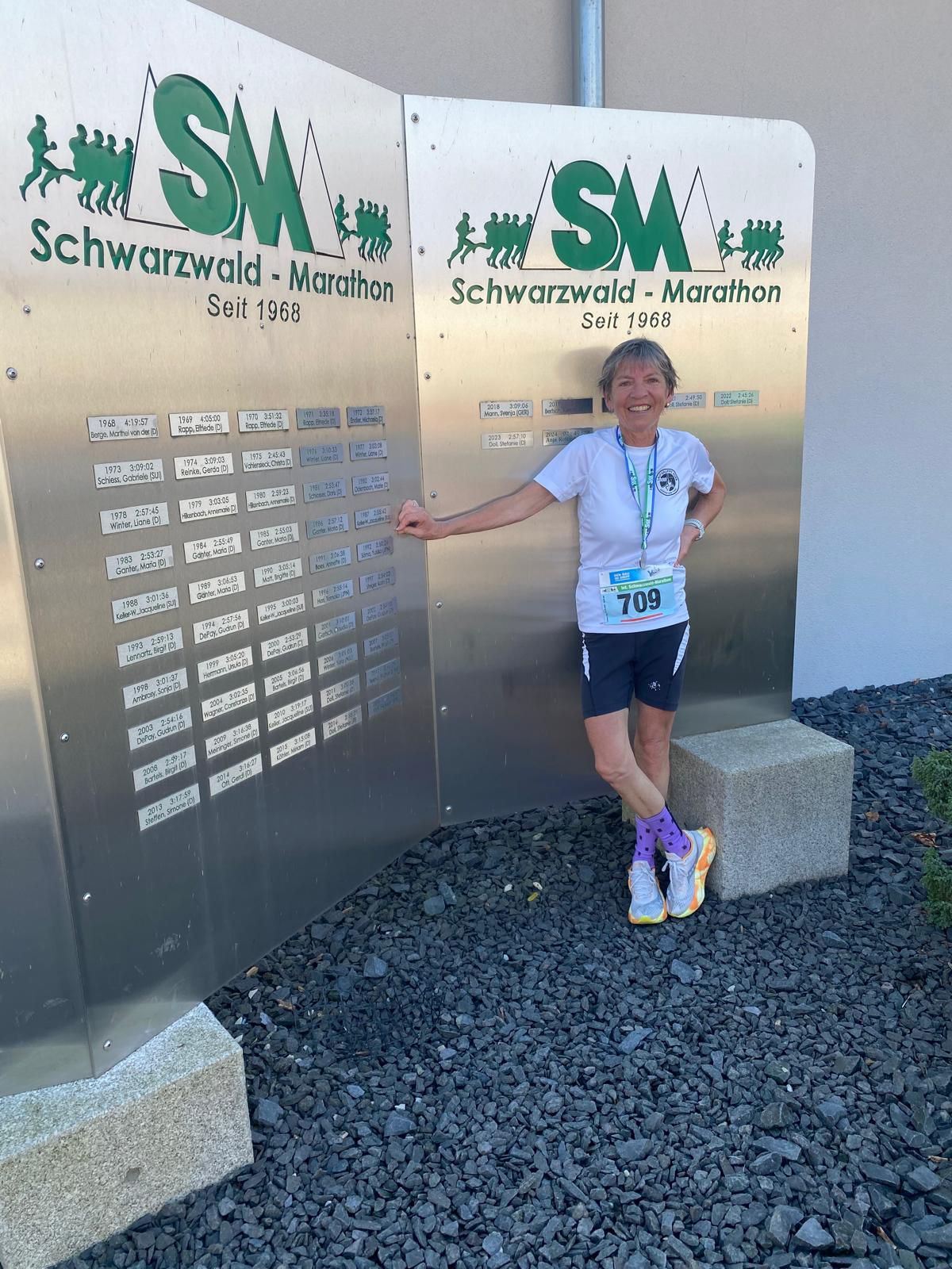 Zum 13. Mal absolvierte ich am 12. Oktober den Schwarzwald-Marathon in Bräunlingen. So viele Leute haben mich nach dem erfolgreich absolvierten Lauf gefragt – jetzt bin ich zu Hause über meine Liste gegangen… Zudem war ich auch mal dort und musste leider aufgeben und einmal lief ich beim Halbmarathon mit und mindestens einmal beim 10 km-Lauf. Zur Erinnerung: Der „Schwarzwälder“ ist der weltälteste Natur- und Frauenmarathon und als Legende weit über die Grenzen Europas hinaus bekannt, vor allem vor dem Aufkommen der Stadtmarathons galt es als Deutscher oder Schweizer Marathon-Läufer als „Muss“ auch dort mal mitzulaufen. Ein Blick ins Archiv – auch auf Wikipedia – bestätigt dies. Die europäische Elite der Marathonläufer gab sich dort in den 60er-, 70er- und 80er-Jahren ein Stelldichein. Für mich ist dieser Lauf und die Strecke sehr speziell: Ich durfte viermal das Siegerpodest besteigen. Das erste Mal im 1987 mit P.B. und nie mehr erreichten 2h55 und das letzte Mal im 2010, als 48-Jährige, in 3h19. Lange wurden die Gesamtsieger- und –siegerinnen in einen Stein, nahe der Stadthalle gemeisselt. Der Stein wurde zu klein und jetzt steht eine schöne, grosse Tafel vor der Stadthalle und dort werden alle Jahre die Sieger*innen mit einem kl. Schild eingraviert. Als ich dies am Vortag sah, wollte ich unbedingt eine Foto von mir vor dieser Tafel – aber erst nach erfolgreich absolviertem (128.) Marathon. Also dann….