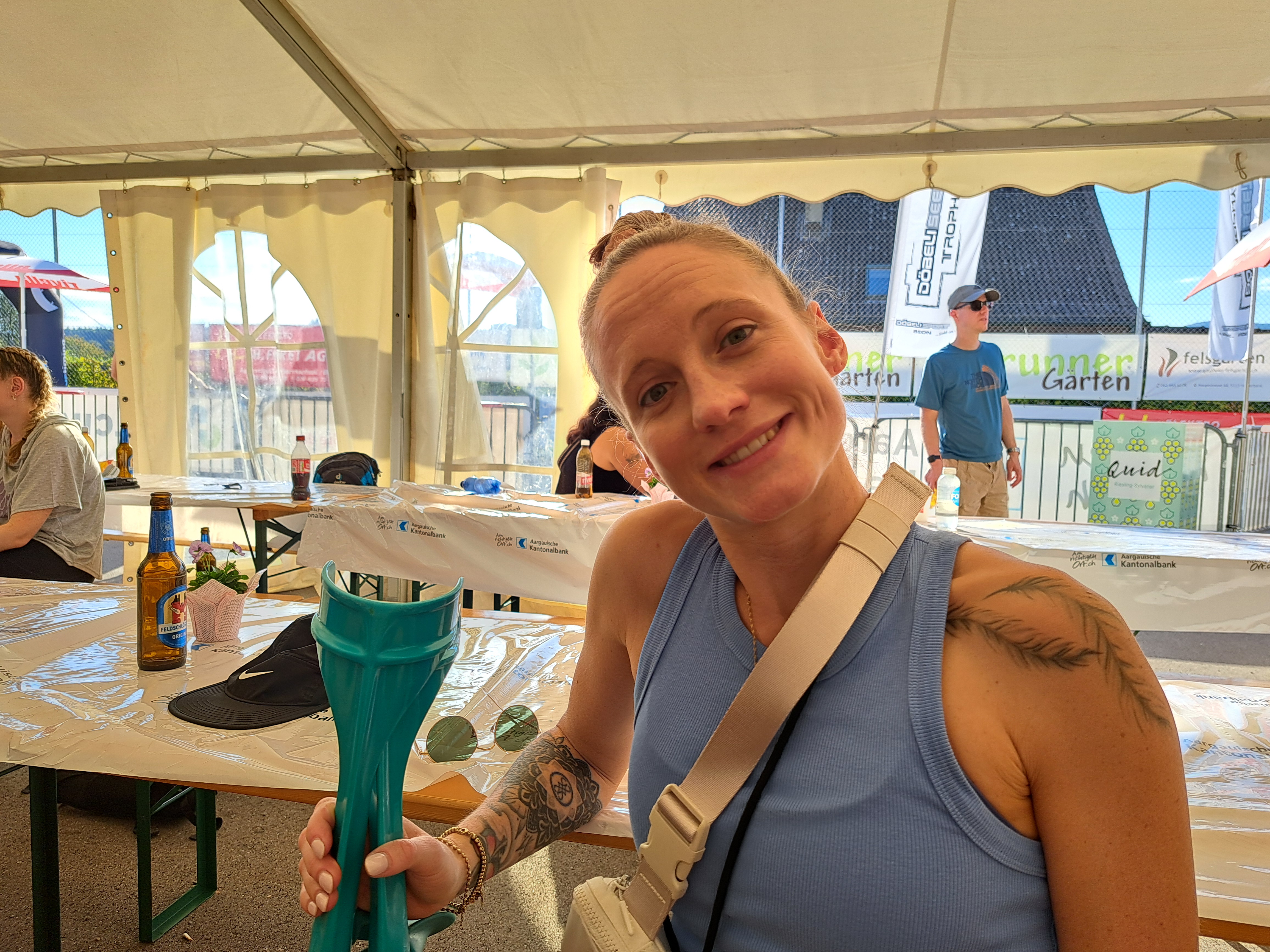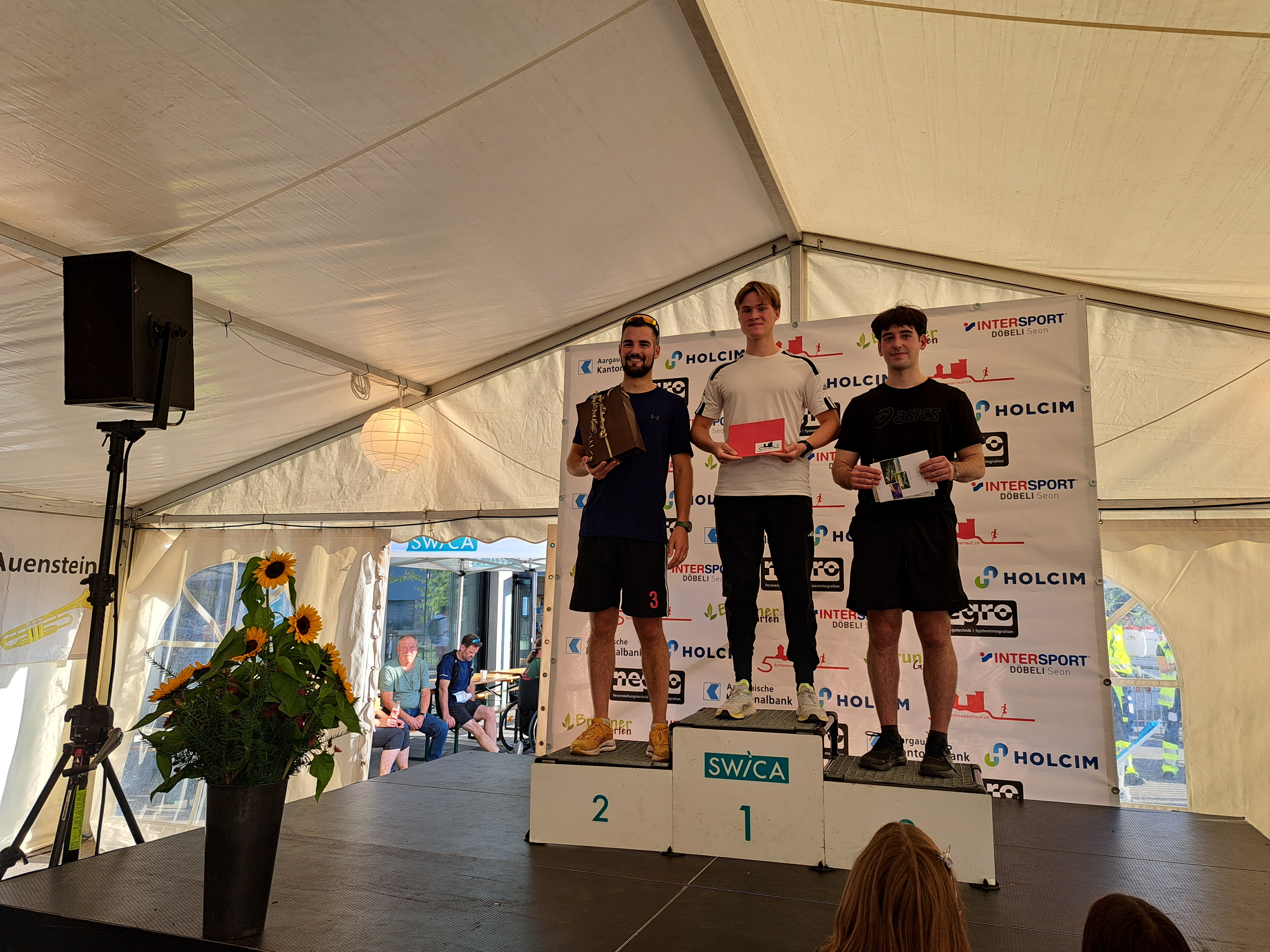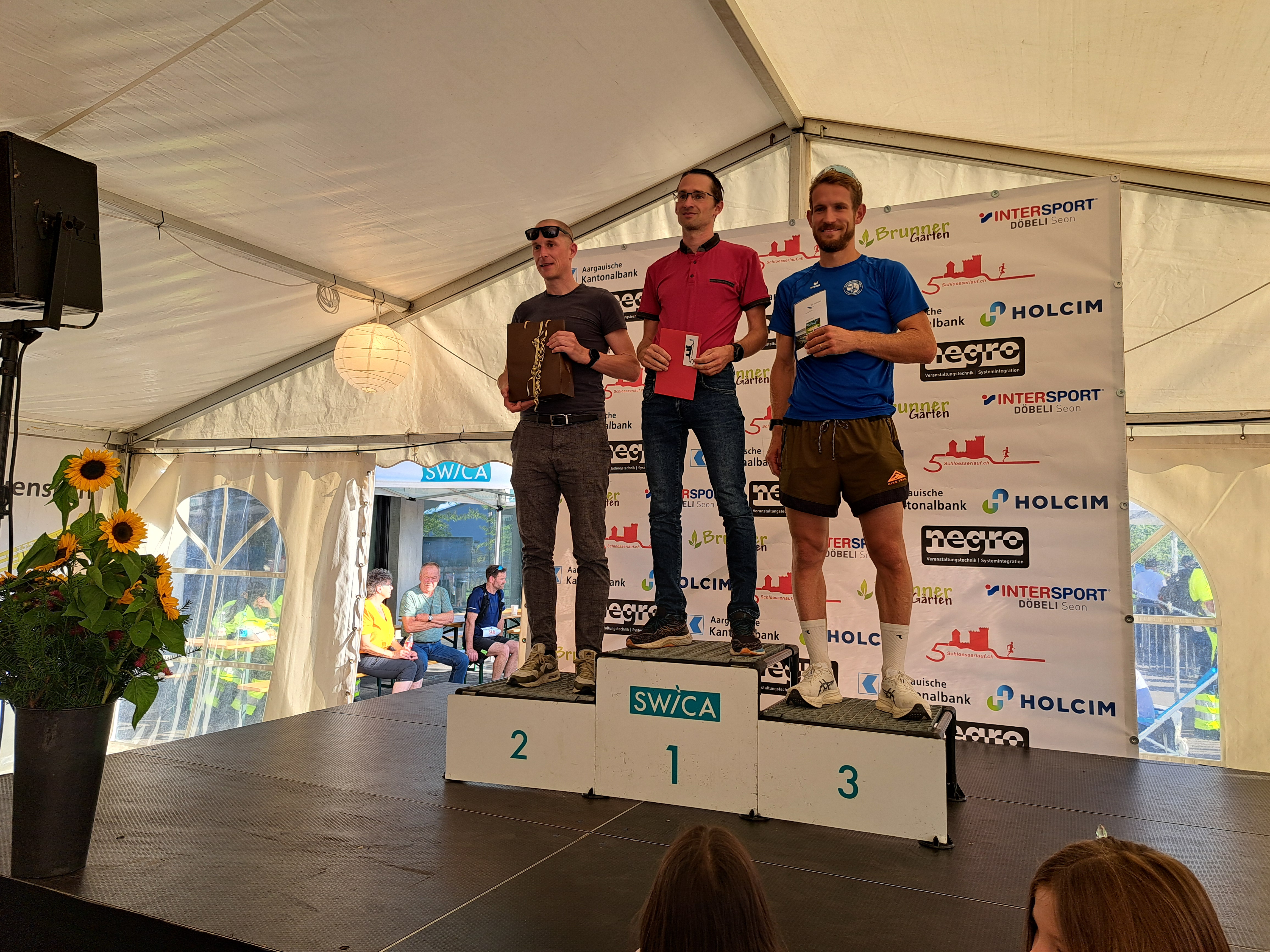 Das hielt die teilnehmenden Hörner jedoch nicht davon ab gute Leistungen zu zeigen. Auf eindrückliche Art tat dies Manuel. Mit einer 1:26er Zeit überquerte er die Ziellinie. Damit schaffte er es nicht nur als Dritter aufs Kategorienpodest. Overall belegte er sogar den siebten Rang. Knapp neben dem Podest landete Jaqueline. Ihr gelang ein wirklich guter Lauf. Dafür reichte es Dominic in seiner Kategorie zum zweiten Platz. Auch er bewältigte den anspruchsvollen Lauf auf souveräne Art. Meine Wenigkeit bestieg auch noch als Zweiter das Podest. Ich war wirklich zufrieden mit dem Lauf. Nur beim letzten Downhill plagten mich Krämpfe und ich musste tatsächlich kurz anhalten und dehnen. Andrea empfing uns als Fan im Ziel und konnte uns die Resultate gleich mitteilen.