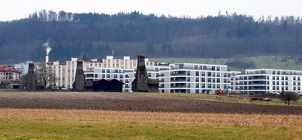 Kaum rennt man weiter, erscheinen vier Bohrtürme die heute für Events gemietet werden können. Je nach Blickwinkel stehen sie futuristischen Neubauten von Zurzach und zeigen den Lauf der Zeit.