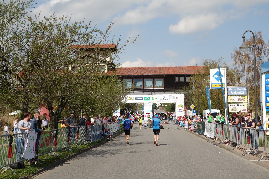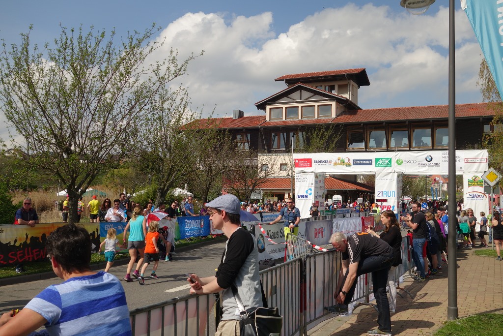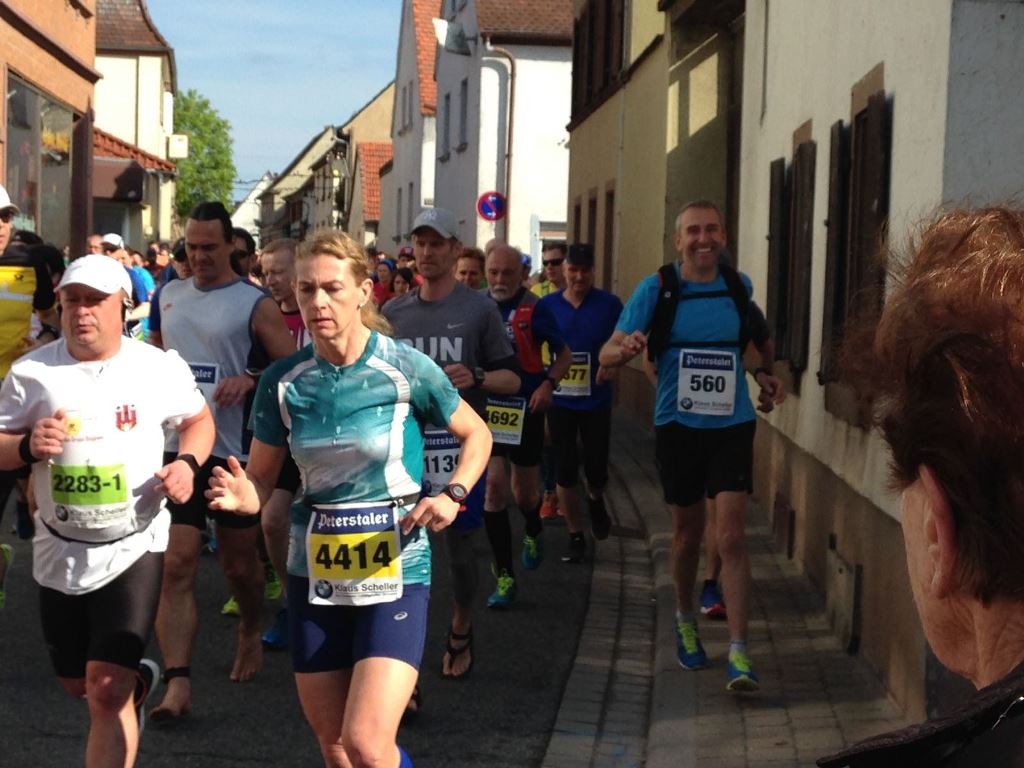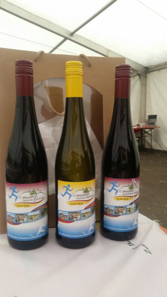 Der Marathon der Deutschen Weinstrasse wird nur alle 2 Jahre ausgerichtet, was ihn so speziell und begehrt macht. Bereits im Januar war der Halbmarathon ausgebucht. Wer Geduld hatte, wurde “trotzdem” belohnt: in der Vorwoche der Veranstaltung “hagelte” es verletzungsbedingte Forfaits und so konnten hoffentlich alle starten, welche wollten. Wobei: ein Schleck ist dieser (Halb-)Marathon keinesfalls: fast pausenlos gehts “rauf und runter”, sodass am Schluss 240 bzw. 495 Höhenmeter zusammenkommen Die Mühen der Steigungen, Richtungs- und Tempowechsel werden aber belohnt mit einer fantastischen, verkehrsfreien Strecke entlang der Weinstrasse und – bei gutem Wetter – tollen Weit- und Ausblicken von eben diesen Weinbergen. Viele Bäume stehen in voller Blüte und – wir laufen ja an einem Sonntag – die Strecke gleicht in den Weinorten teilweise einem Schaulaufen durch enge Publikumsspaliere. Obwohl ich kaum etwas hörte, bekam ich die gute Stimmung entlang der Strecke bestens mit... auch in der Nase! Denn: in einigen der Orte gibts Rieslingfässer mit Schwämmen, welche man über sich ausdrücken kann. Ich verzichtete darauf – irgendwie schmeckt der Riesling nach der Wasserdusche und dem Anziehen von frischen Kleidern aus einem Glas besser...