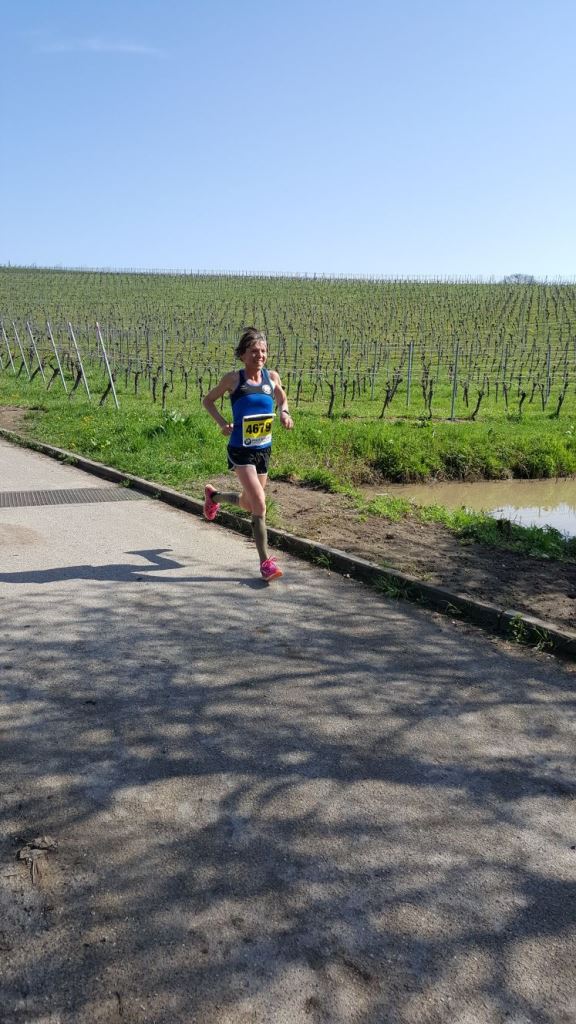 Vor 10 Jahren, 5 Monate nach einer Achilles-Sehnen-OP, nahm ich das letzte Mal am Halbmarathon teil. 1h41.33 war damals meine Zeit und ich war, in Anbetracht des Trainingsrückstandes, sehr zufrieden. Was macht wohl das Alter aus? Sind 1h45 ein realistisches Ziel? Ich gebs zu: Primär wollte ich 1h45 schaffen und gerne aufs Kategorien-Podest laufen! Beides gelang mir und hocherfreut war ich, als ich meine Zeit erfuhr: 1h41.23. Somit gelang mir auch der Kategorien-Sieg, was mich sehr freute (und meinen Mann wohl auch... gabs doch 3 Flaschen feinsten Pfälzer-Wein als Preis!). Dass der Weinstrassen-Marathon ein veritabler Volkslauf (HM und Marathon mit insgesamt ca. 3’500 Teilnehmern) ist, sieht man auch an meinem Overall-Rang: 5. Frau – wann hats das zum letzten Mal gegeben? Ich weiss es ehrlich nicht mehr...