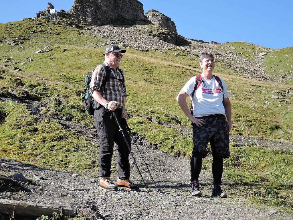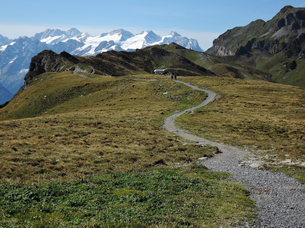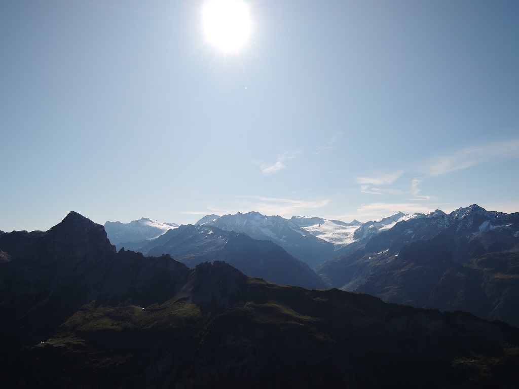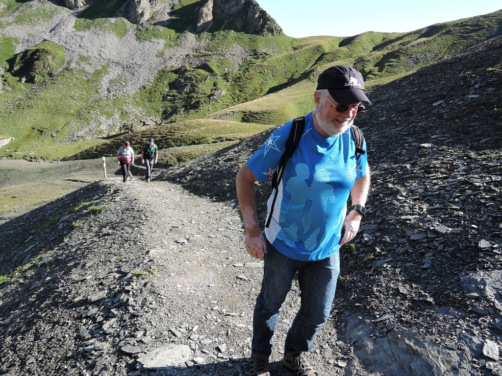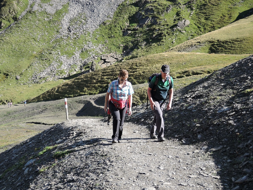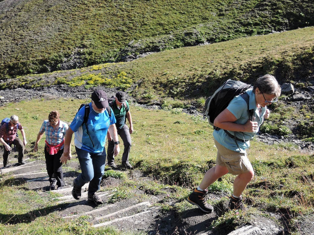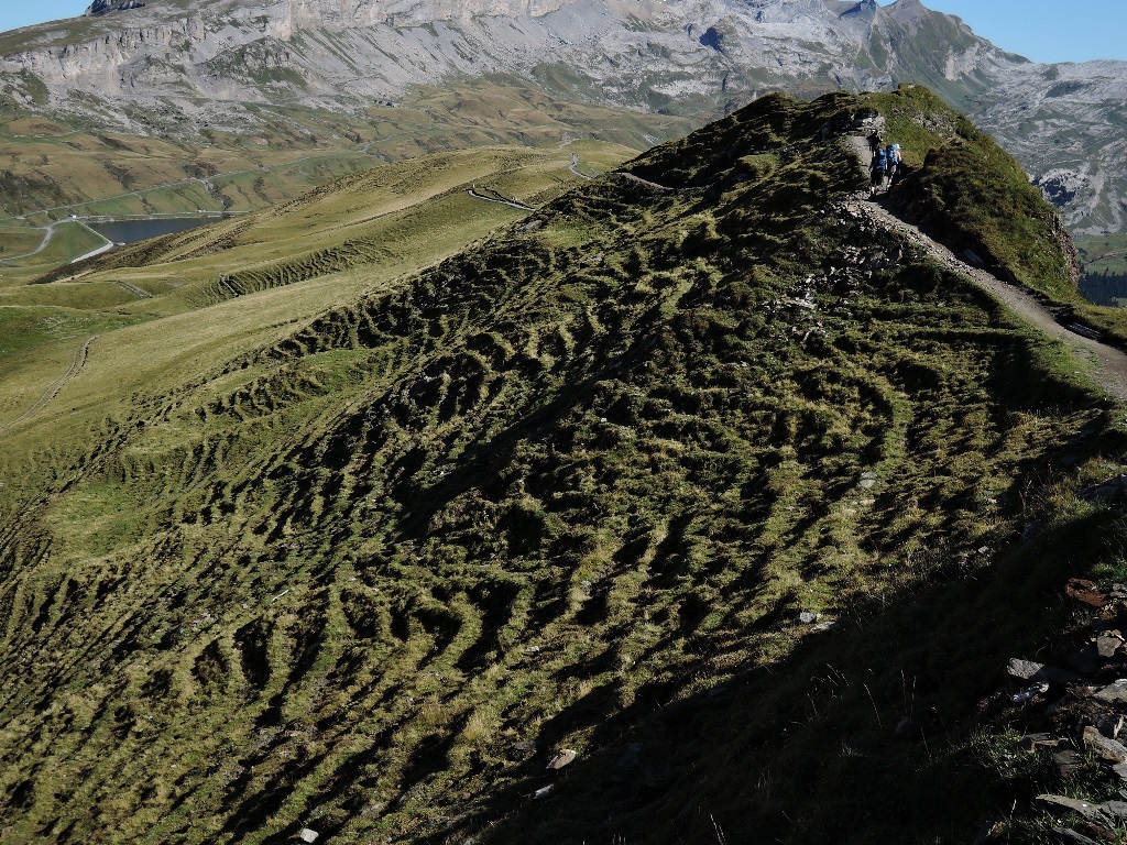 Alsbald erfolgte der Aufstieg zur Balmeregg. Zuerst sanft ansteigend wurde der Weg immer steiler. Eine steinige, steile Partie erinnerte uns an die Moräne des Jungfrau Marathons. Oben angekommen eröffnete sich uns ein herrlicher Ausblick mit Sicht auf Titlis, Triftgletscher und weiteren Gipfeln.