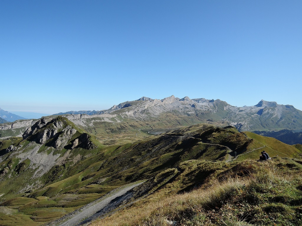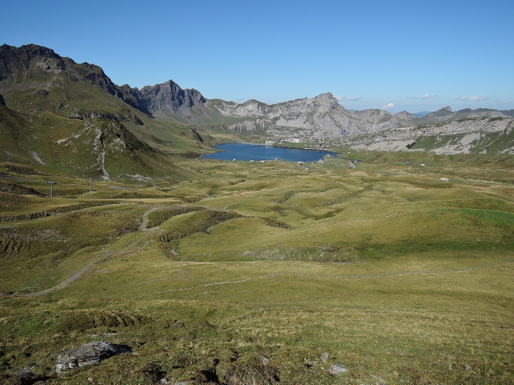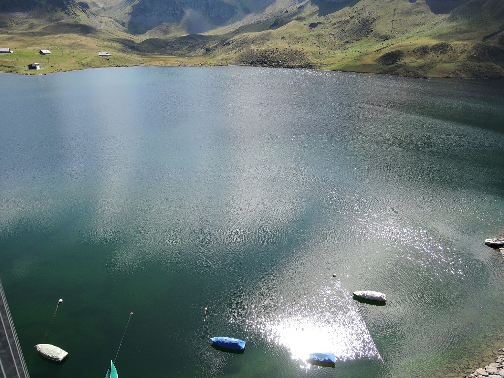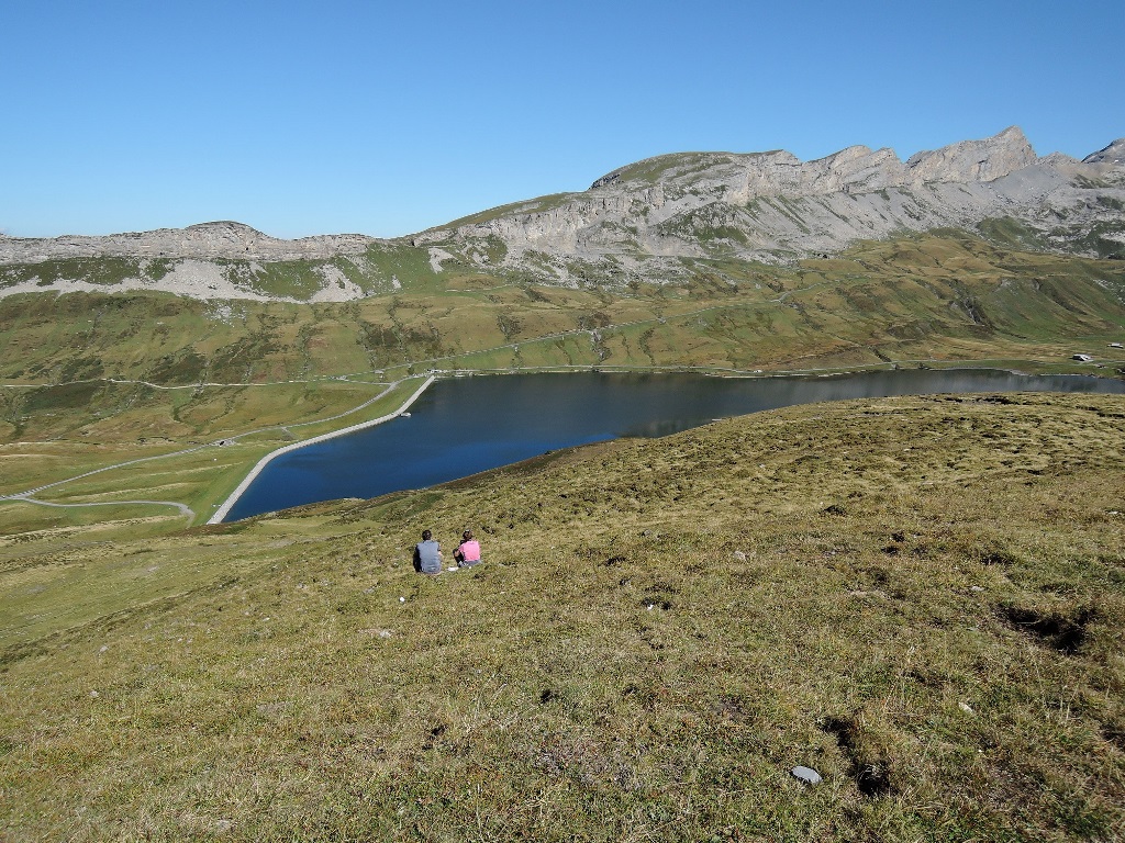 Wir stiegen auf der anderen Seite des Hochtals wieder ein wenig hoch und marschierten zurück nach Melchsee Frutt. Dabei konnten wir nochmals den zurückgelegten Weg betrachten, während unter uns die Seen glitzerten. Die Felsen unterhalb des Bonistockes sind ein bekanntes Klettergebiet. Soviele Kletterer habe ich hier noch nie beobachten können. Wie Ameisen hingen sie in den Seilen und erklommen Meter um Meter.