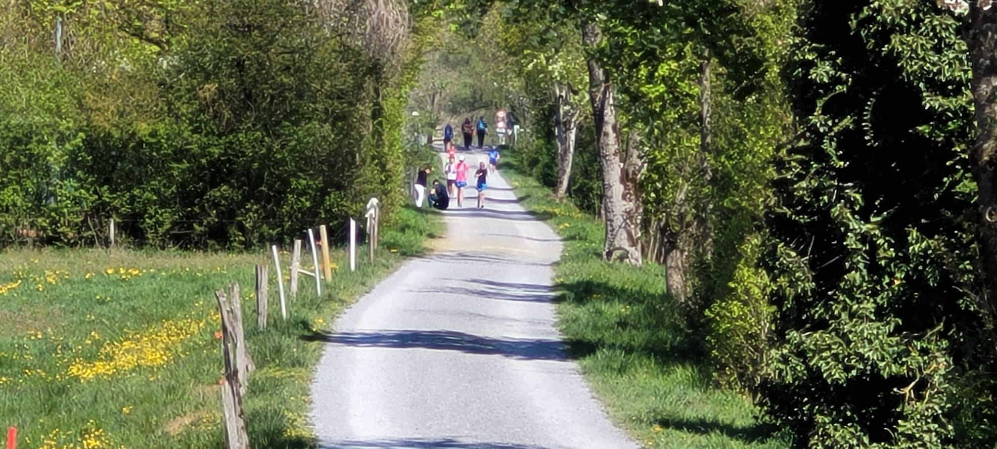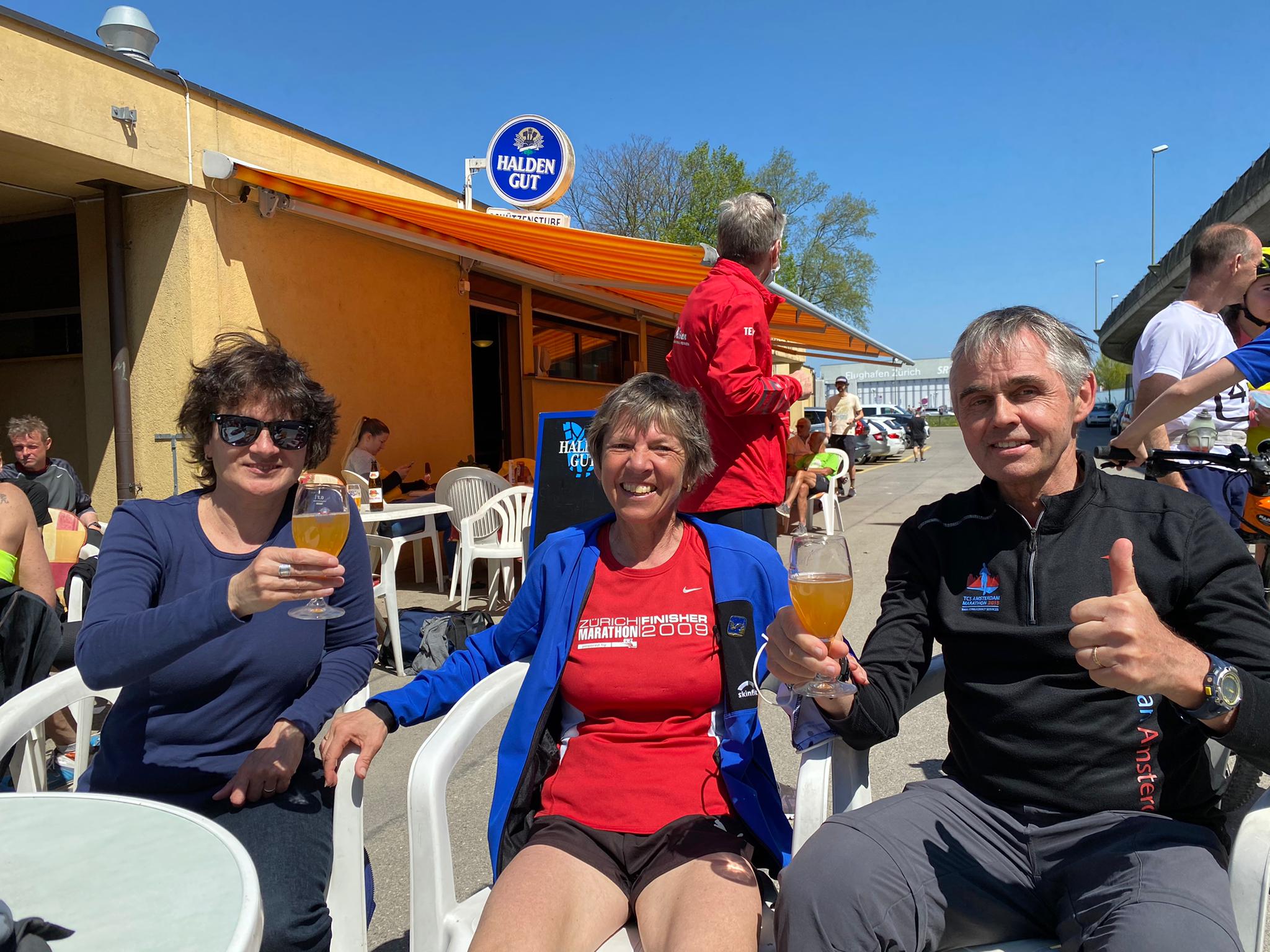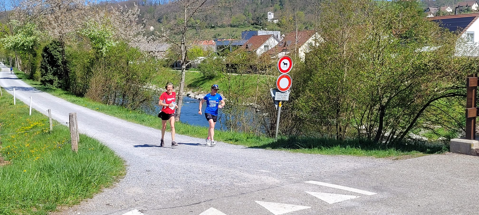Wenn es etwas auszusetzen gibt/gab auf der Strecke, dann waren es die vielen Radfahrer an diesem sonnigen Sonntag, welche unterwegs waren. Zwar waren die meisten rücksichtsvoll, aber es gab da auch ein paar andere… jä nu… solche «Andere» gibt’s halt immer und überall. In meiner Gruppe, 5.45er-Schnitt, waren wir ca. 9 Personen, wobei in Bülach, beim Wendepunkt des ¾-Marathons, deren 5 wendeten. Somit liefen wir anfänglich zu viert – drei Damen und ein Hahn im Korb – nach Glattfelden. Zu meiner grossen Freude stand da für mich noch ein Mini-Fanclub bereit: Schwiegersohn Dan unterstützte mich, indem er nicht nur fotografierte, sondern auch rund 3 km mitlief. Danke, Dan! Und danke für die Fotos! Es war übrigens das einzige Mal, an welchem ich auf die Uhr schaute: rund 2h01 und 21,12 Kilometer bei der Brücke Glattfelden. Unser Hahn im Korb liess nun die Frauen «springen» und oft plaudernd nahm unser Trio den Rückweg unter die Füsse. Dabei begegneten wir vielen virtuellen Läufern, ganz im Sinne von: «De Züri-Marathon findet statt». Erwähnen möchte ich, dass natürlich auch beim «Albis-Run» die meisten die Zürcher-Nummer gelöst hatten, was ihnen die 42 km (und 195 Meter) sicher erleichterte.