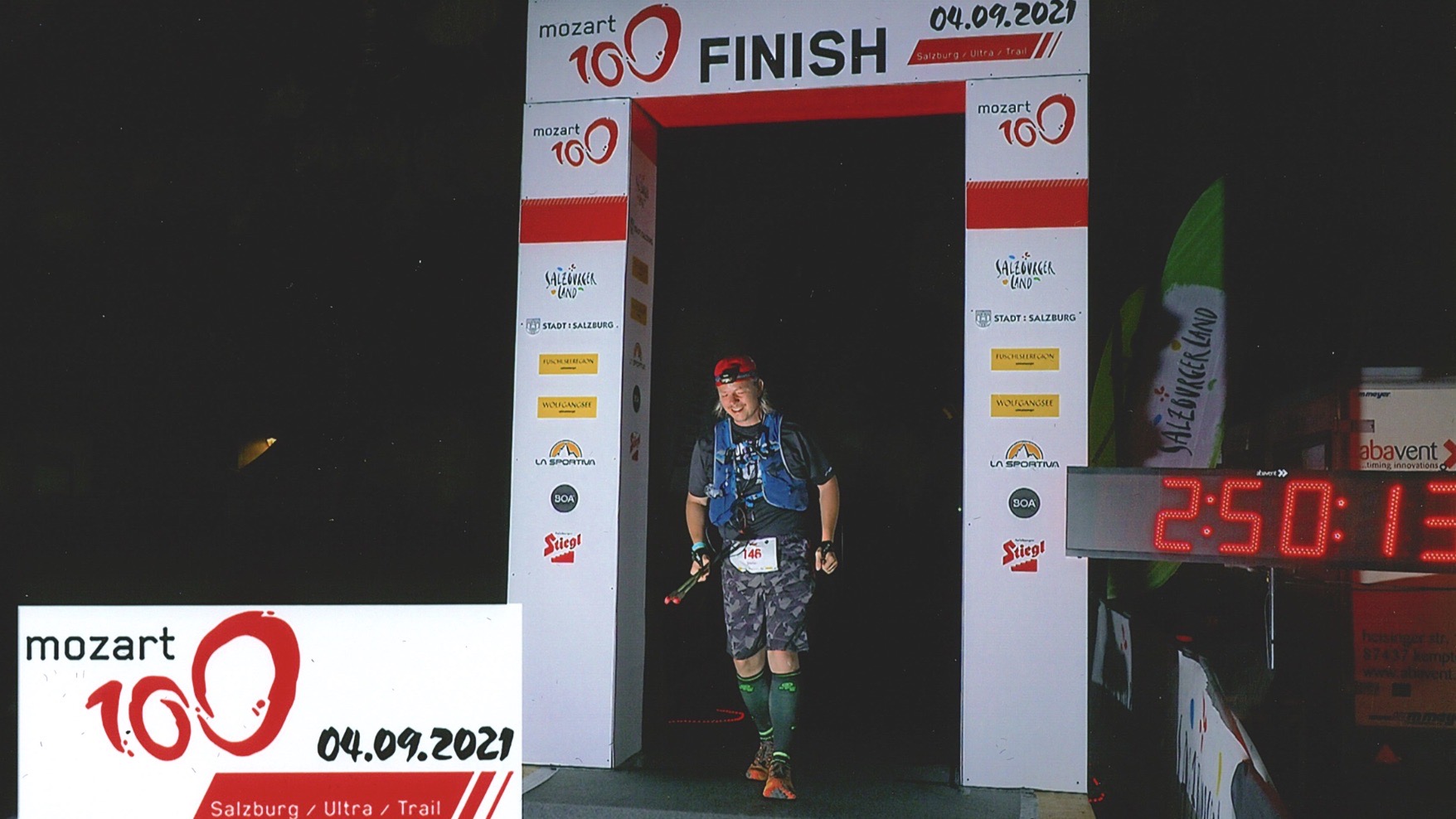 Jetzt noch einmal vom Mozartplatz quer über den Residenzplatz auf direktem Weg zum Kapitelplatz ins Ziel. Es ist 2:50 am Sonntagmorgen als ich Ziellinie überlaufe, trotz dass ich erst kurz vor Schluss einlaufe, werde ich von den dort anwesenden wie der Sieger des Rennens empfangen. Sichtlich erschöpft aber glücklich und stolz die 108 Kilometer mit rund 5000 Höhenmeter geschafft zu haben, durfte dann aber auch das obligatorische Finisherbier nicht fehlen. Im Race-Office wurde mir dann noch ein eingerahmtes Bild von meinem Zieleinlauf überreicht (Wie geil ist das den). Im Anschluss lasse ich mir ein Taxi rufen und fahre zurück ins Hotel (Gehen hätte ich zu diesem Zeitpunkt eh nicht mehr können).