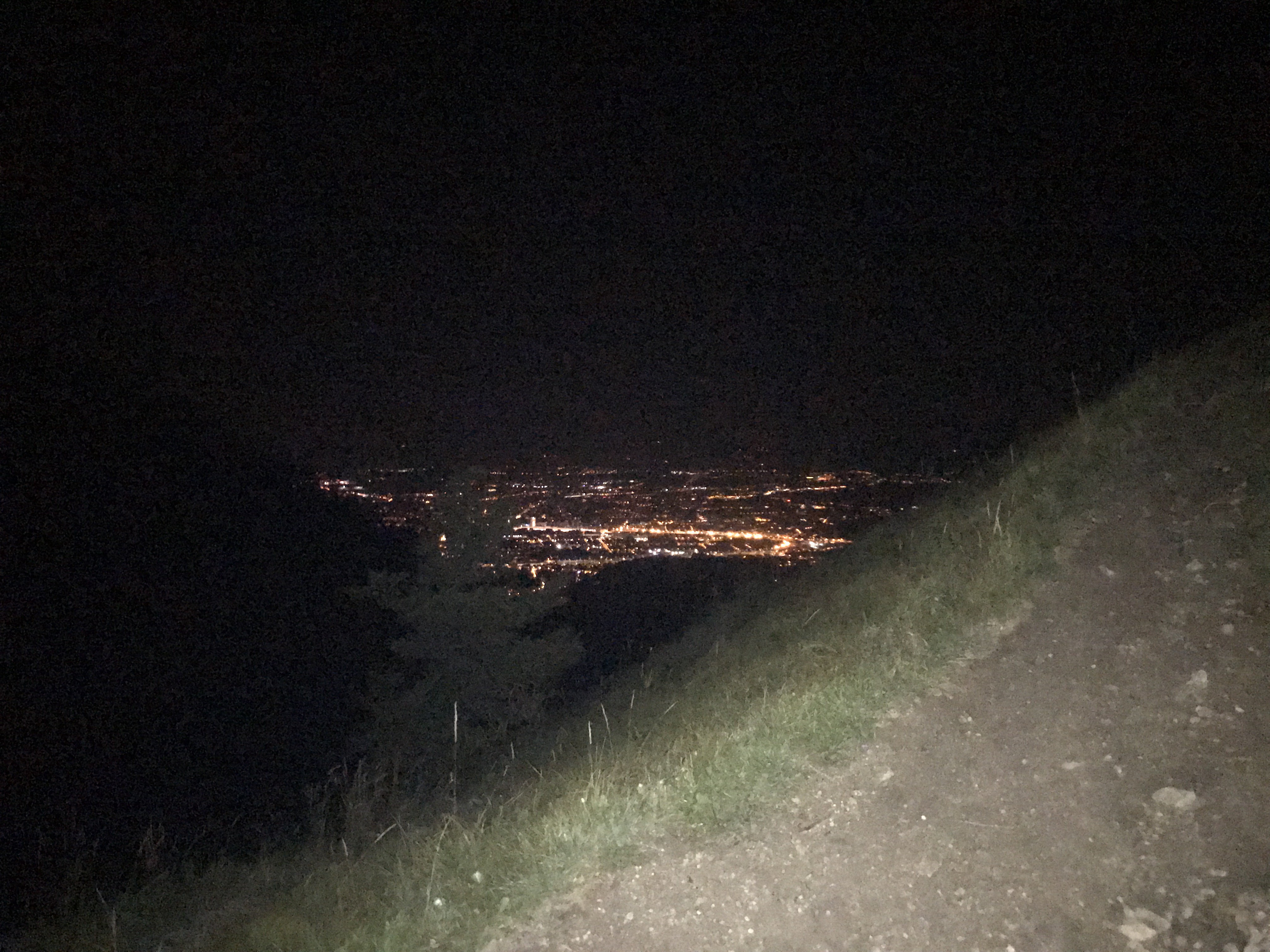 Trotz dass es mittlerweile Stockdunkel ist und ich ohne Stirnlampe praktisch meine eigene Hand vor Augen nicht mehr erkennen kann, heisst es Attacke und rauf auf den Nockstein denn irgendwie müssen ja die fast 5000 Höhenmeter zusammen kommen. Oben angekommen sehe ich zum ersten Mal die hellerleuchtende Stadt Salzburg. Das Ziel schon in greifbarer Nähe, dachte ich zumindest. Der Downhill vom Nockstein runter wollte gefühlt nicht enden. Es geht technisch sehr anspruchsvoll über Singletrails, schmalen Waldwegen und durch ein ellenlanges trockenes mit Geröll gefülltes Bachbett. Ich komme aus dem Wald heraus, wechsle kurz 2-3 Worte mit den Helfern, die dafür sorgen das ich sicher auf die andere Seite der Strasse komme und verschwinde dann schon wieder in das nächste dunkle Waldstück.