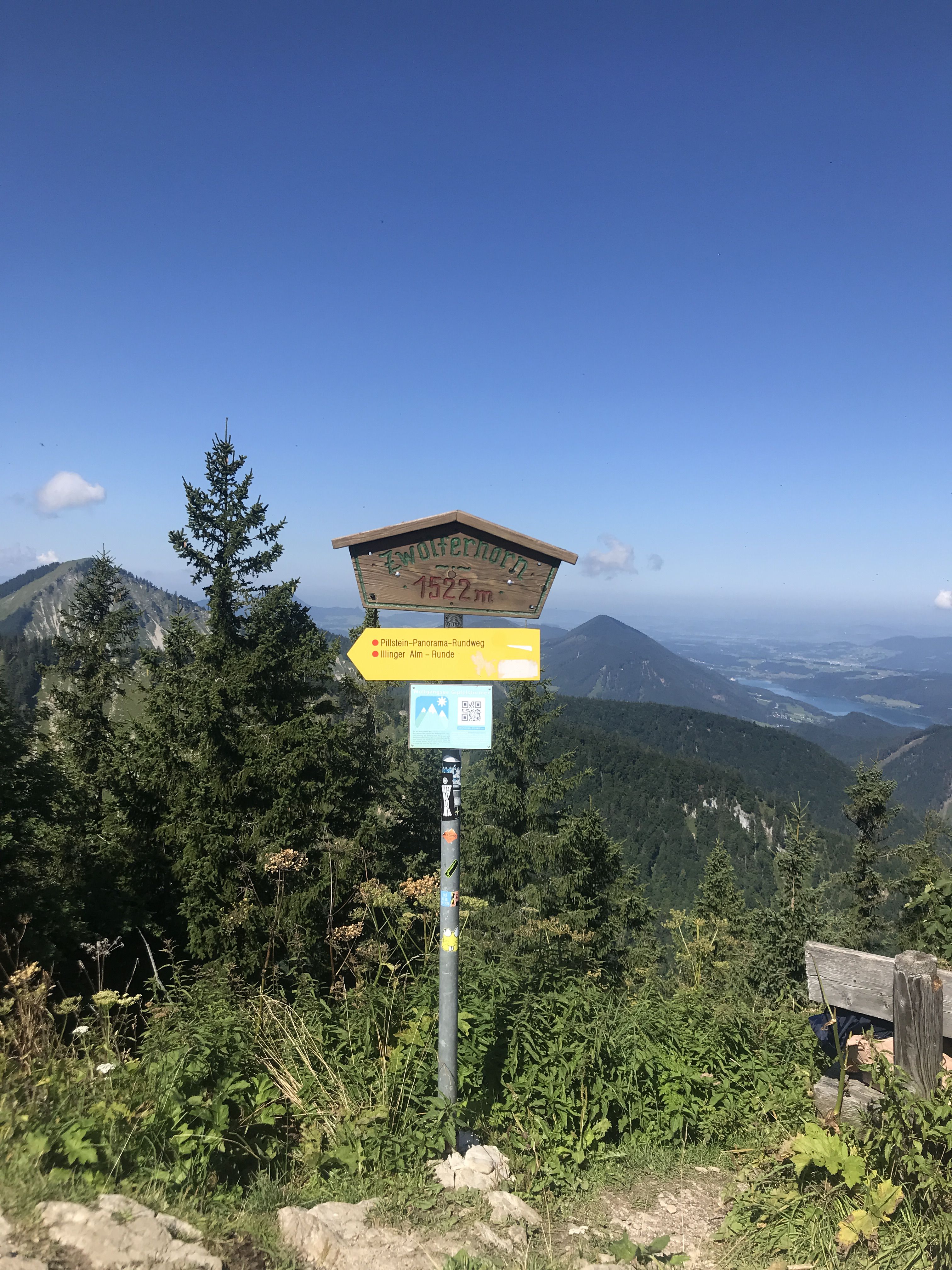 Nach circa 8 Kilometer verlassen wir den asphaltierten Teil der Strecke und sind dann fast nur noch auf Trails und Feldwegen unterwegs. Nach dem ich in Fuschl am See angekommen bin, habe ich die ersten 31 Kilometer hinter mir und es ist Zeit die erste richtige Pause. Jetzt heisst es Tshirt- und Schuhwechsel, Getränke und Vorräte auffüllen, kurz die Beine lockern und weiter gehts. Man will schliesslich nicht zu spät zu seinem Rendezvous mit dem Zwölferhorn kommen. Oben auf dem Gipfel angekommen, nahm ich mir die Zeit kurz zu verweilen und die wirklich herrliche Aussicht zu geniessen. Den was danach kam war alles andere als entspannend. Es folgte eine für mich sehr anspruchsvolle Downhill Passage von rund 1000 Höhenmeter am Stück. Sehr konzentriert und fokussiert, wie und wo man den nächsten Schritt setzte, war entscheidet, wenn man nicht als menschliche Kanonenkugel den Berg herunter rollen wollte. Kurz vor St.Gilgen treffe ich auf einen Wegposten, der mit seiner Glocke die Läufer zu Höchstleistung motivierte und je nach Bewerb die Teilnehmer in die richtige Richtung wies. Gerne auch mal mit dem Spruch: Da geht's nach St.Gilgen, in 40 Kilometer sehen wir uns hier wieder (Motivieren kann er ;-).
