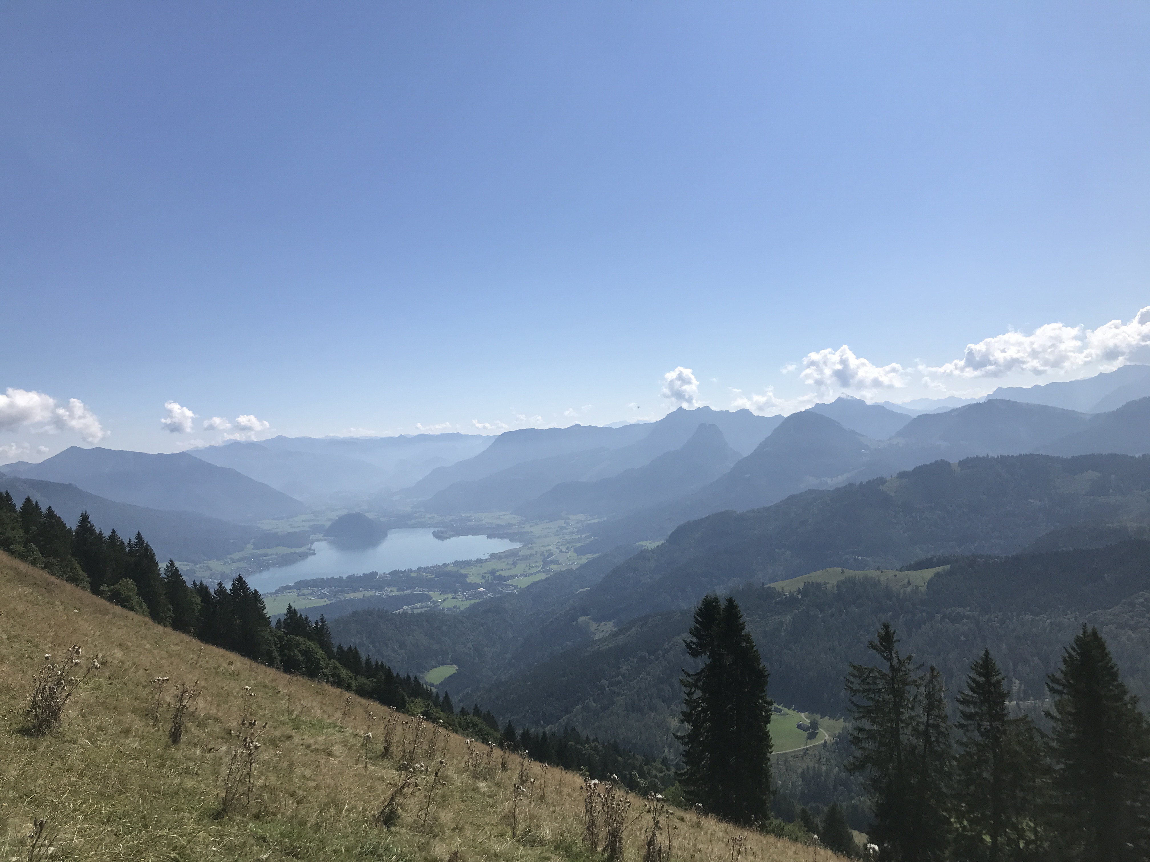 Nach einem kurzen Stopp beim Verpflegungspunkt am Wolfgangsee geht es dann weiter auf die Schafbergalm. Der Anstieg ist diesmal gefühlt unwegsamer und insgesamt schwerer als der vorherige hoch zum Zwölferhorn. Dies ist auch das erste Mal, dass meine Oberschenkel Beschwerde einlegen. Aber damit müssen sie jetzt halt leben (Sie werden es mir die darauffolgenden Tage mit einem meiner schlimmsten Muskelkater danken). Zumindest positiv ist, dass dieser Teil der Strecke fast ausschliesslich im Wald verläuft. Die vorherrschenden Temperaturen um die Nachmittagszeit hätten mir sonst sicher den Rest gegeben. Oben angekommen ein Blick auf die Uhr: 55 Kilometer, Halbzeit!! Juhuu.
