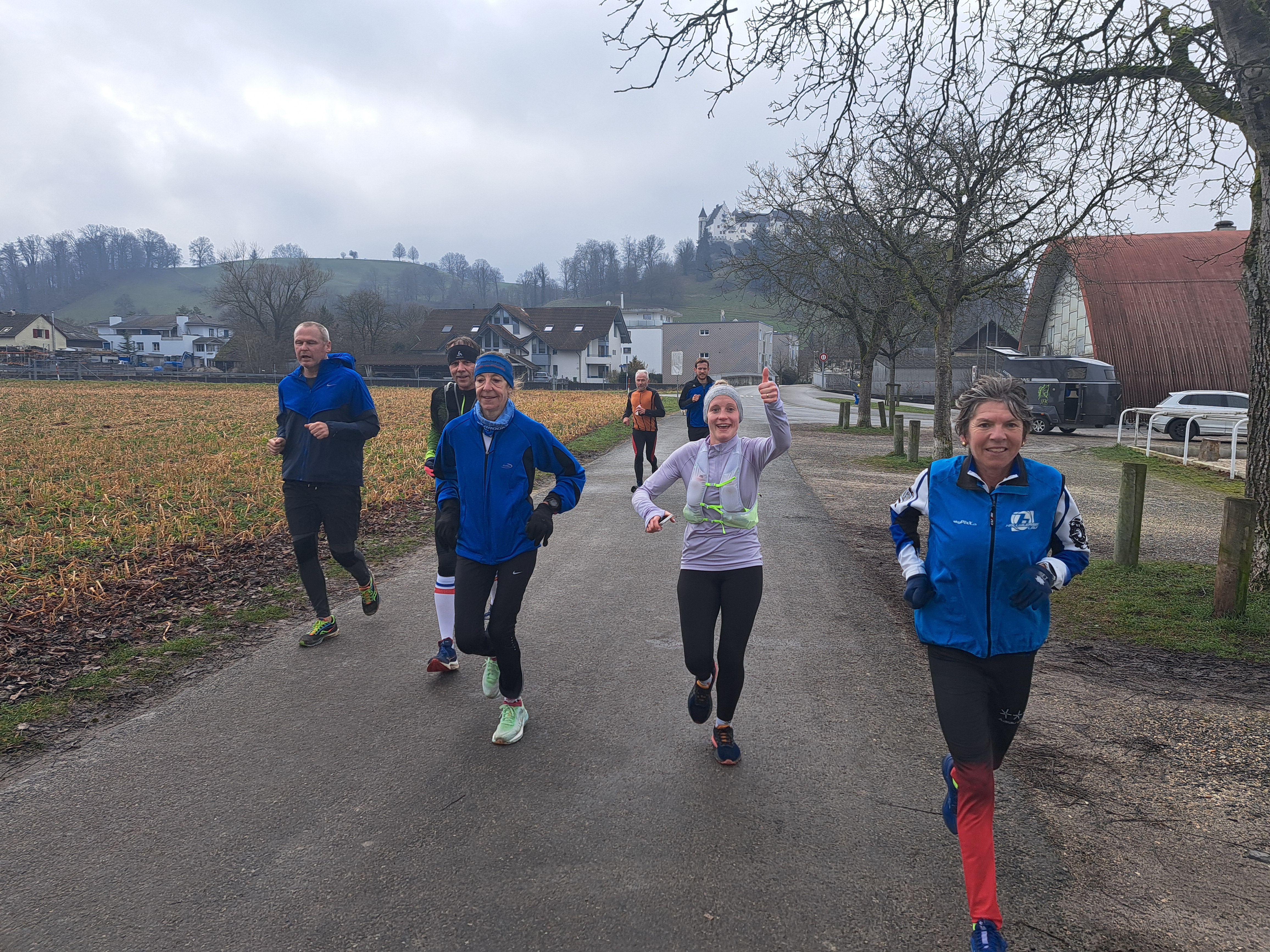 Nach einer kurzen Rast und dem obligaten «Gipfelfoto» ging es daran die gewonnenen Höhenmeter wieder abzubauen. Beim Weiler Wildenstein gelangten wir auf einen kurzen Abschnitt des Lenzburger-Laufs und nahmen dann die nächste Steigung zum Schloss in Angriff. Vorbei an der Mehrzweckhalle, dem früheren Start des Lenzburger-Laufs, gings dann vorbei am römischen Theater zur Wilhalde. Ueber Wildegg führte uns dieser Long Jog wieder zurück zum Start.