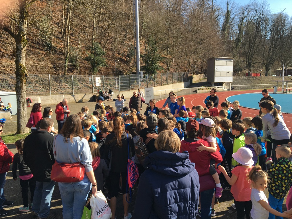 Vielen Dank an Thierry Leimbacher und Severine Sieber, dass sie sich bereit erklärt haben, mir zu helfen. Zusammen mit Sämi Küng von der LV Wettingen-Baden und meiner Wenigkeit, schafften wir es erstaunlich gut, die 100 (!) teilnehmenden Kinder “in den Zügeln” zu halten. Alles klappte wie am Schnürchen! Nach der Begrüssung wurden die Kinder in vier Gruppen eingeteilt und wir fuchsten die Youngsters in die Taktik eines Laufes ein!