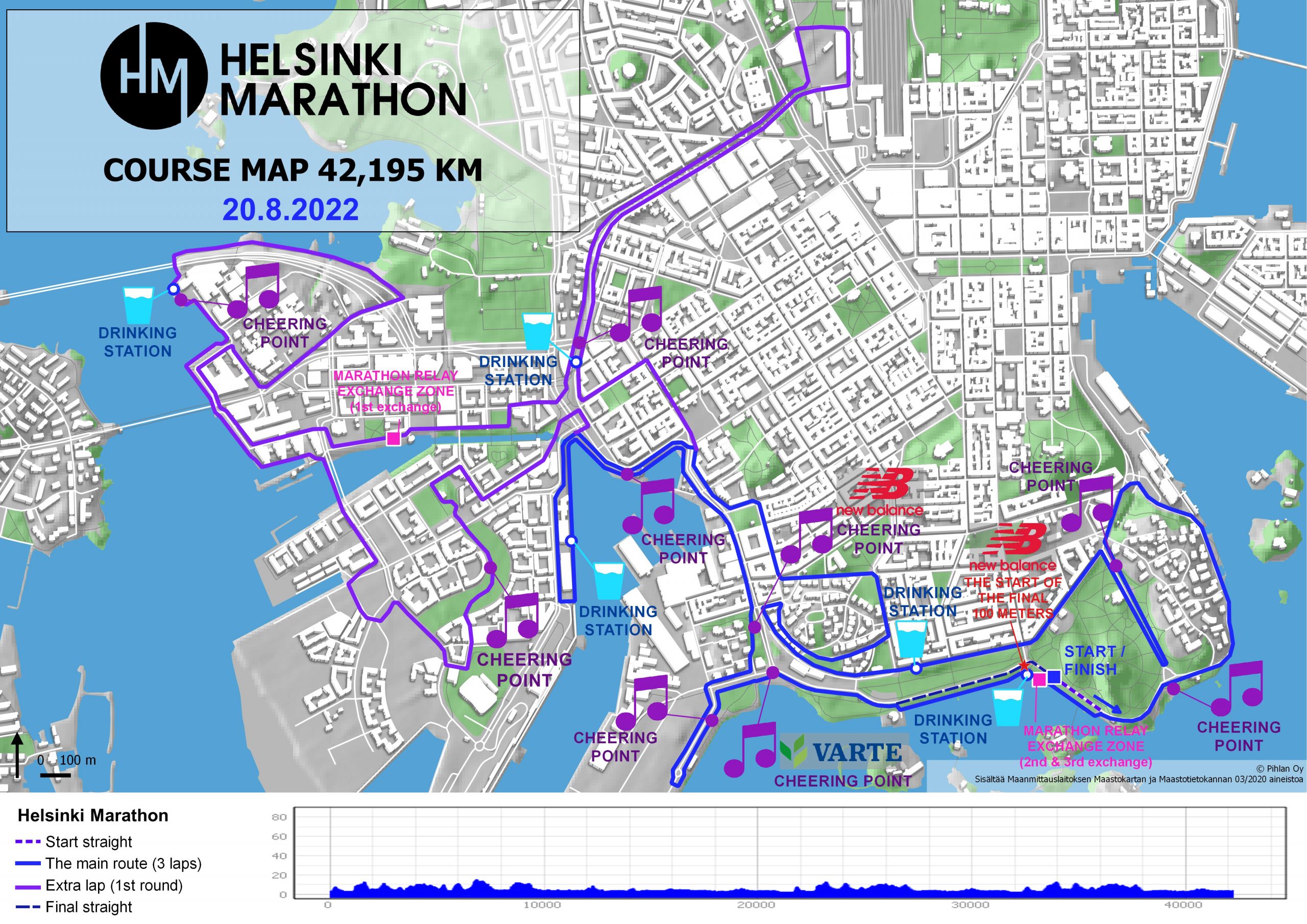 Samstagsmorgens beim Start um 8.30 Uhr waren es dann schon 24° und von der Ostsee wehte ein stark böiger Wind. 3 Hauptrunden und eine extra Schlaufe galt es zu absolvieren. Nach 6km verliessen wir die Hauptrunde, um eine 10km lange Schlaufe mehrheitlich durch Hafen- und Bürogebiet zu laufen. Bei km 16 kamen wir dann wieder auf die Hauptrunde und liefen dann noch 5km Richtung Start/Ziel. Von den etwa 2000 Teilnehmern stiegen etwa 2/3 nach dem Halbmarathon aus. Wir Marathonis mussten noch 2 Hauptrunden laufen. Wie man am Profil sieht, war die Strecke recht coupiert. Immer wieder kurze Steigungen und sehr viele Richtungsänderungen. Der Wind tat sein Übriges.